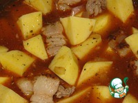 Снять с плиты, немного остудить. Добавить паприку и уксус. Залить все бульоном. Приправить лавровым листом, майораном, тмином, солью и перцем по вкусу. |