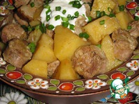 Описание: Интересный и простой рецепт картофельного жаркого, в котором вместо мяса используются колбаски, копченые или нет - это уже Вам решать.