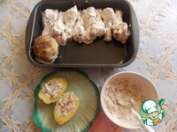 Поставить все вместе в духовку на 1 час при температуре 180*C. После того, как прошел час, вынимаем противень, добавляем на курицу тертый сыр, ставим еще минут на 20-30. Достаем и все готово. |