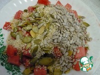 Теперь к нарезанным кусочкам арбуза добавить кунжут и семечки. |
