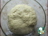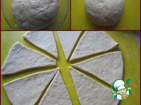 Через два-три часа тесто удвоится в объёме. На слегка посыпанной мукой поверхности раскатать половину в круг диаметром около 35-40 см. Нарезать треугольными секторами. |