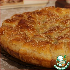 Потом, накрыв середину оставшимися кусочками теста, смазать слегка взбитым яйцом, и посыпать кунжутом. Выпекать в духовке при 180 С до готовности и приятного румянца. |