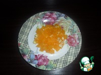 Почистить апельсин. Нарезать небольшими кубиками, выложить первый слой. |