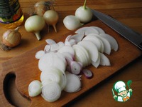 Чистим лук, моем его и заливаем холодной водой для того, чтобы не исплакаться, пока его порежем. Хотя, кто хочет иметь красивые глаза, этот момент пропустить. |