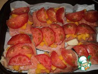 Помидор нарезаем полукольцами (можно кружками) и кладём сверху тыквы. |