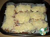 Поливаем сверху смесью сметаны и майонеза, посыпаем тёртым сыром. Запекаем в духовке около 20 минут при температуре 200 градусов. |