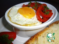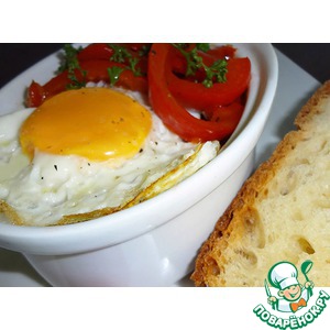 В это время отдельно поджариваем 2 яйца. Это можно сделать и просто вбив яйца в перец за несколько минут до готовности. Солим, перчим. Подаем порционно с хлебушком. |