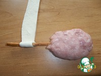 Затем берем небольшие кусочки фарша и лепим на соломку. |