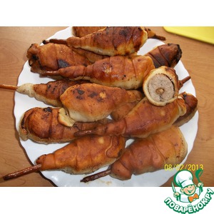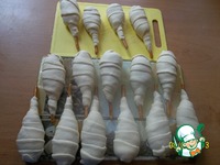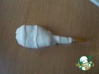 Берем соломку с фаршем и от середины оборачиваем тестом. |
