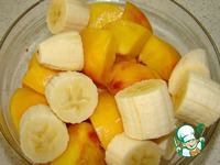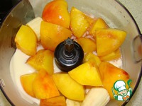 В блендере взбить йогурт, персик и банан, после добавить теплый сок с желатином, взбить. |