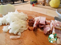 Мелко нарежьте лук и грудинку и обжарьте их на сковороде в масле до прозрачности. |