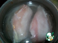 Куриное филе (у меня грудка - разрезала на 2 части и отделила от кости) моем, замачиваем на ночь в соляном растворе. |