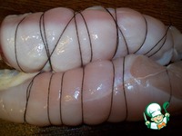 Мясо вынимаем из раствора, обсушиваем, обматываем ниткой, чтоб филе не распадалось. |