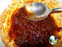 Смешиваем мёд, растительное масло, паприку, чеснок, продавленный через пресс, чили и щепотку мускатного ореха. |