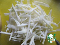 Порезать соломкой либо натереть на терке. Слегка присолить и оставить минут на 10. Потом слить образовавшуюся жидкость, соломка стала более нежной. |