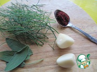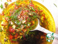 Для приготовления заправки для салата использую молоденькую травку фенхеля, очищенный чеснок, листочки шалфея, сумах (для придания легкой кислинки). Травку измельчить помельче вместе с чесноком. |