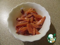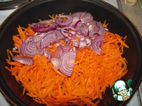 Морковь трем на крупной терке, лук режем полукольцами и обжариваем на подсолнечном масле с добавлением соли и перца. |