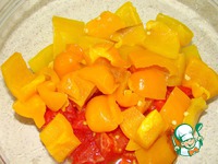 Достать противень из духовки и выложить перец и помидоры и снова запекать 15 минут. |