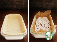Тесто раскатать, перенести в форму (у меня 20х11 см), обровнять края, дно наколоть вилкой. Выстелить бумагой для выпечки, положить груз и поставить минут на 5 в разогретую до 200*С духовку. |