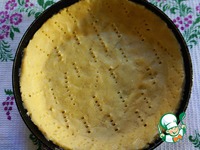 Форму смажем маслом, раскатаем из теста круг и выложим в форму. Сформируем аккуратные бортики, наколем основу вилкой. |