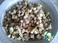 Баклажаны почистить, нарезать мелкими кубиками, добавить соль и оставить на 30 мин, чтобы вышла горечь. После промыть холодной водой, отжать. |