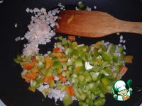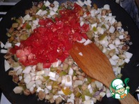 | Лук и перец нарезать мелкими кубиками, мелко нарезать чеснок. Помидоры ошпарить кипятком, снять кожуру, нарезать кубиками. |