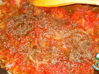 Помидоры в собственном соку нарезаем кубиками, и отправляем в сковороду к луку вместе с сахаром, тмином и соевым соусом. Солим, перчим. Тушим 5 минут. |