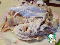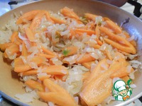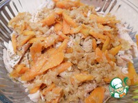 Далее укрываем мясо курицы зажаркой из лука и моркови. |