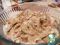 Теперь собираем нашу запеканку - на дно формы выкладываем куриную мякоть, посыпаем ее специями (в ход идут смесь для сациви и чабрец). |