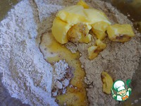 К сухой смеси добавим молоко, яйцо и размягченное сливочное масло. Замесим тесто. Оно получается очень послушным, с тестом очень легко работать. |