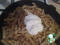 К поджаренным кальмарам добавить сметану, перемешать. Подождать пока выпарится жидкость, если она выделилась из сметаны. |