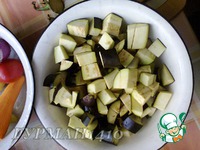 4. Пока стекает сок с баклажанов, делаем подливку. Режем мелко лук, морковь, перец, помидоры (очищенные от кожуры). |