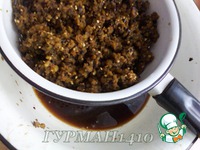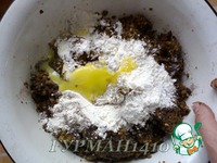 7. Пока жарится подливка, делаем котлеты. В фарш из баклажан добавляем соль, яйцо, муку, черный перец. |