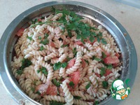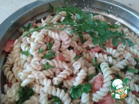 Вермишель отварить аль дэнтэ. Мне больше всего нравится в таком салате вермишель "бантики". Но на этот раз брала такую, какую нашла в шкафу. Помидоры залить кипятком на 1-2 минуты. Снять кожуру и порезать. Петрушку тоже режем.