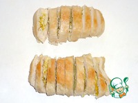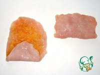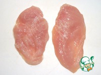 С куриного филе убрать лишнее масло с помощью салфетки и нарезать на кусочки, как показано на фото. |