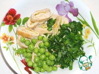 Свежий зеленый горошек (можно замороженный) отварить в течение 3 - 5 минут, слить воду, охладить, добавить в салатник к курице и зелени. |