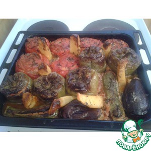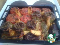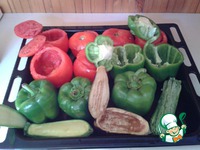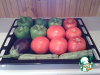 Предварительно вымытые овощи ( помидоры, перец, кабачки и баклажаны) укладываем в глубокий жаропрочный противень. |