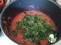 Нарезаем петрушку, большую часть отправляем в кастрюлю с рисом, доливаем 150 мл воды. |