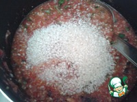 Крупно режем лук и помещаем его вмете с "овощными внутренностями" в блендер. В получившуюся кашицу добавляем рис, оливковое масло, соль, сахар, перец. |
