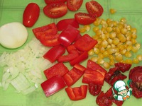 Лук мелко нарезать. Перец и вяленые томаты порезать полосками, а черри пополам. |