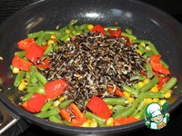 Описание: В диком рисе содержится медь, кальций, йод, железо, аминокислоты – лизин, метионин, и треонин, фолиевая кислота. Кроме того, в нем содержится большое количество протеина, поэтому его употребление в пищу придаёт силу мышцам. В черном рисе вообще нет насыщенных жиров и холестерина. После стольких достоинств, стоит ли упоминать о том, какую пользу организму он приносит? Дикий рис с овощами - это блюдо здорового питания.