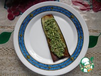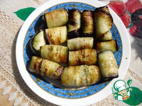 Баклажан выложить на тарелку, сверху равномерно выложить немного начинки, свернуть рулет. Для праздничного стола можно украсить шпажками - красиво и удобно. |
