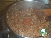 Когда лук поджарен, кидаем мясо, перемешиваем, накрываем крышкой и тушим в собственном соку, пока он не выпарится. Иногда перемешиваем. |