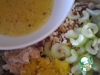 Готовый рис, апельсины, черешню, сельдерей, индейку поместите в миску. |