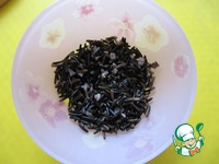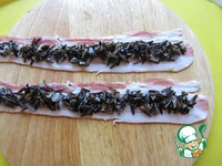 На ленточку бекона выложить по всей длине отваренный дикий рис. У меня бекон был солоноват, поэтому я не солила рис, а поперчить можно, если любите поострее! |