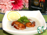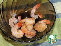 Раздить суп по порционным тарелкам, украсить лимоном и жареными креветками |