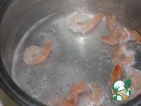 Креветки отварить, воду не выливать, она нам пригодится для соуса. Креветки очистить, панцири сложить в воду, в которой варились креветки, и варить 20 минут на медленном огне, бульон процедить |