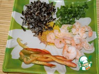 Приготовить начинку: очищенные креветки, мелко нарезанный зеленый лук, отваренный дикий рис, полосками нарезанный болгарский перчик |