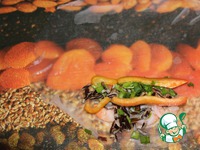 Аккуратно разложить ее на столе и выложить на 1 край начинку: креветки, лучок, рис, перчик |