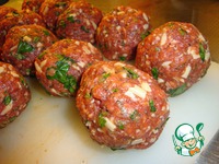 Смешиваем все ингредиенты для тефтелей: фарш, яйцо, пармезан, рубленый базилик, томатная паста, давленый чеснок, 1 ч. л. соли и 0,5 ч. л. чёрного перца. Из полученного фарша формируем 12 тефтелей. |